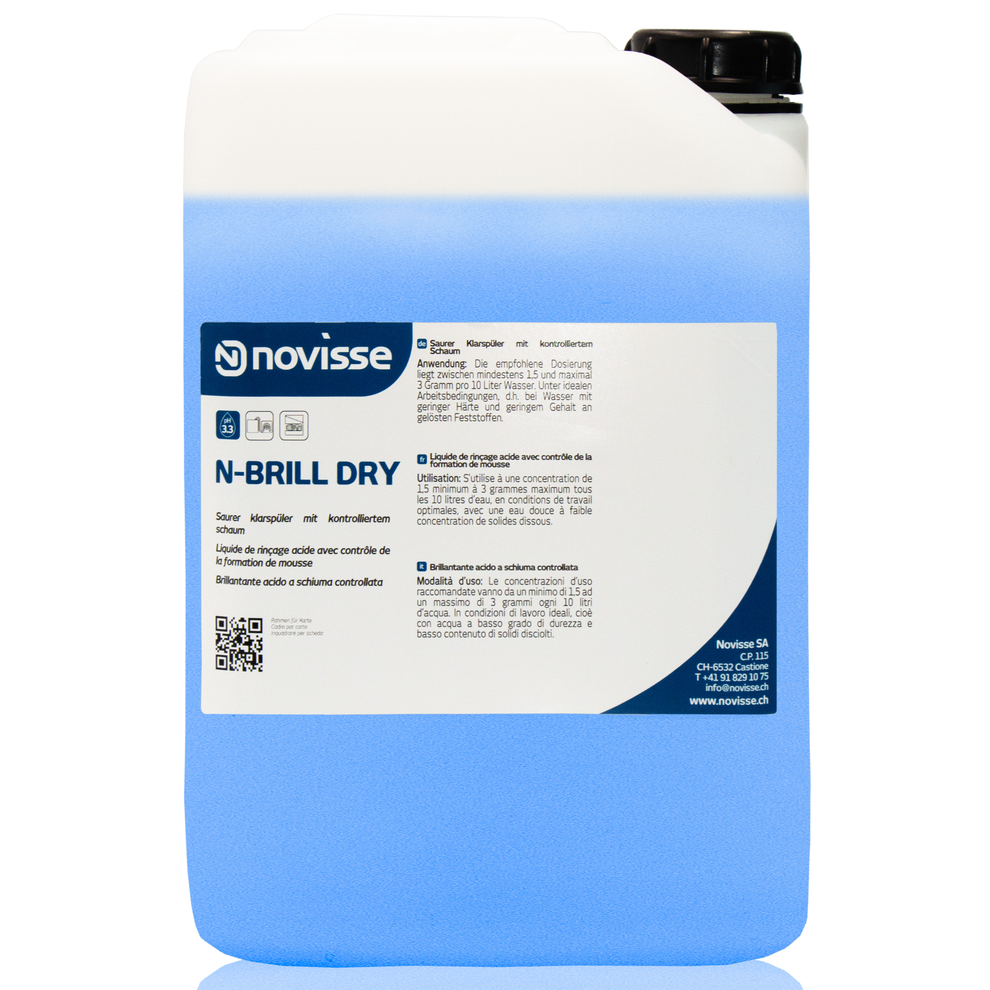 N – BRILL DRY ist ein konzentrierter Klarspüler mit sauren Eigenschaften, der die Oberflächenspannung des Abspülwassers reduziert und die sofortige Trocknung von Geschirr, Tellern, Besteck, Gläsern und Tabletts fördert. N – BRILL DRY wird über diespezifischen Dosiervorrichtungen automatisch dosiert.