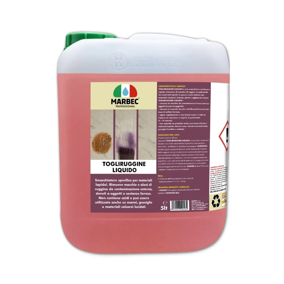 TOGLIRUGGINE LIQUIDO ist ein Fleckenentferner speziell für die schnelle Entfernung von Rostflecken und Metalloxiden aus Steinmaterialien, die auch empfindlich sind: Terrakottafliesen, keramische Materialien, Marmor, Stein und Terrazzo.