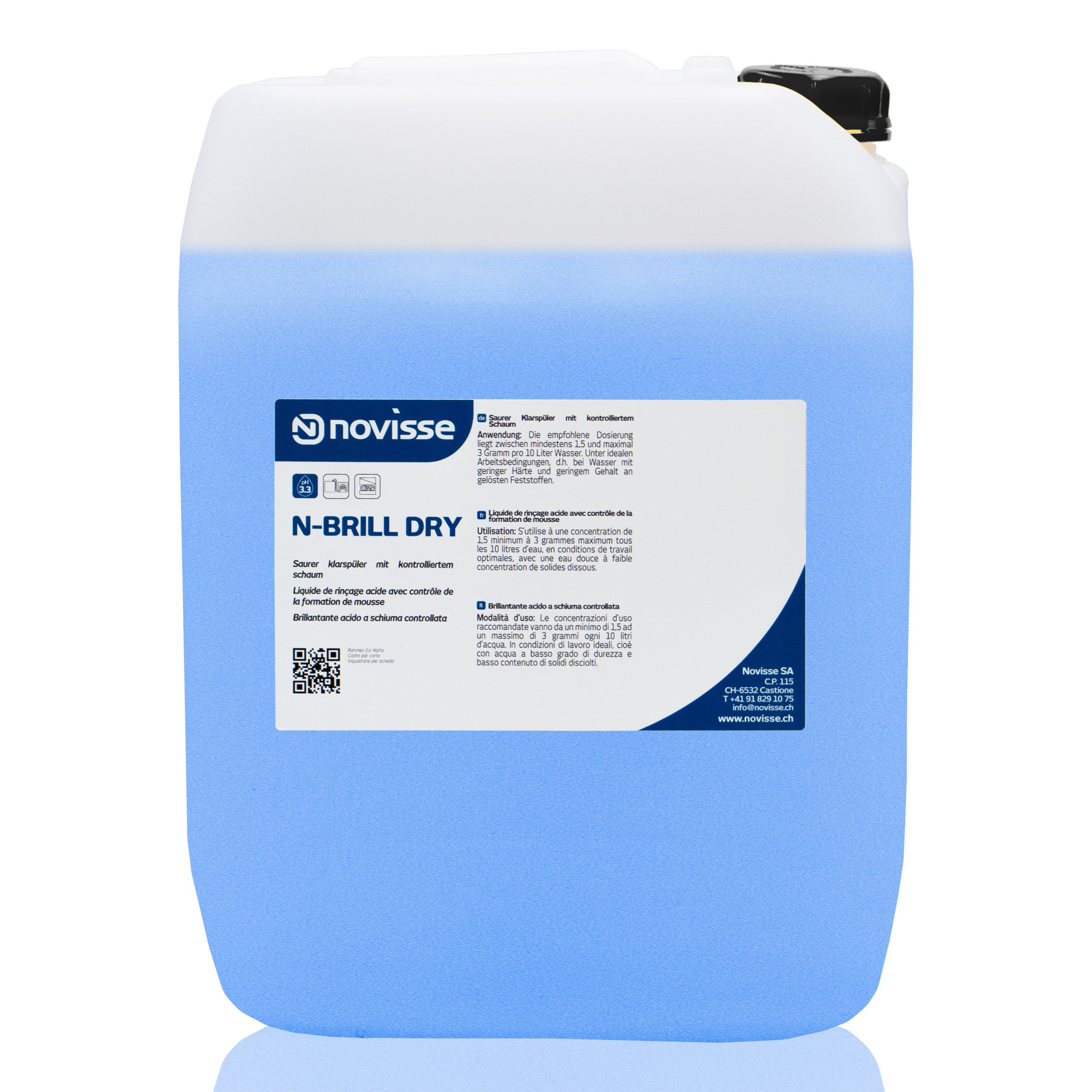 N – BRILL DRY est un additif liquide concentré, aux caractéristiques acides, qui réduit la tension superficielle de l’eau de rinçage et favorise le séchage immédiat des assiettes,couverts, verres et plateaux. N – BRILL DRY est dosé automatiquement par les systèmes de dosage automatique spécifiques.