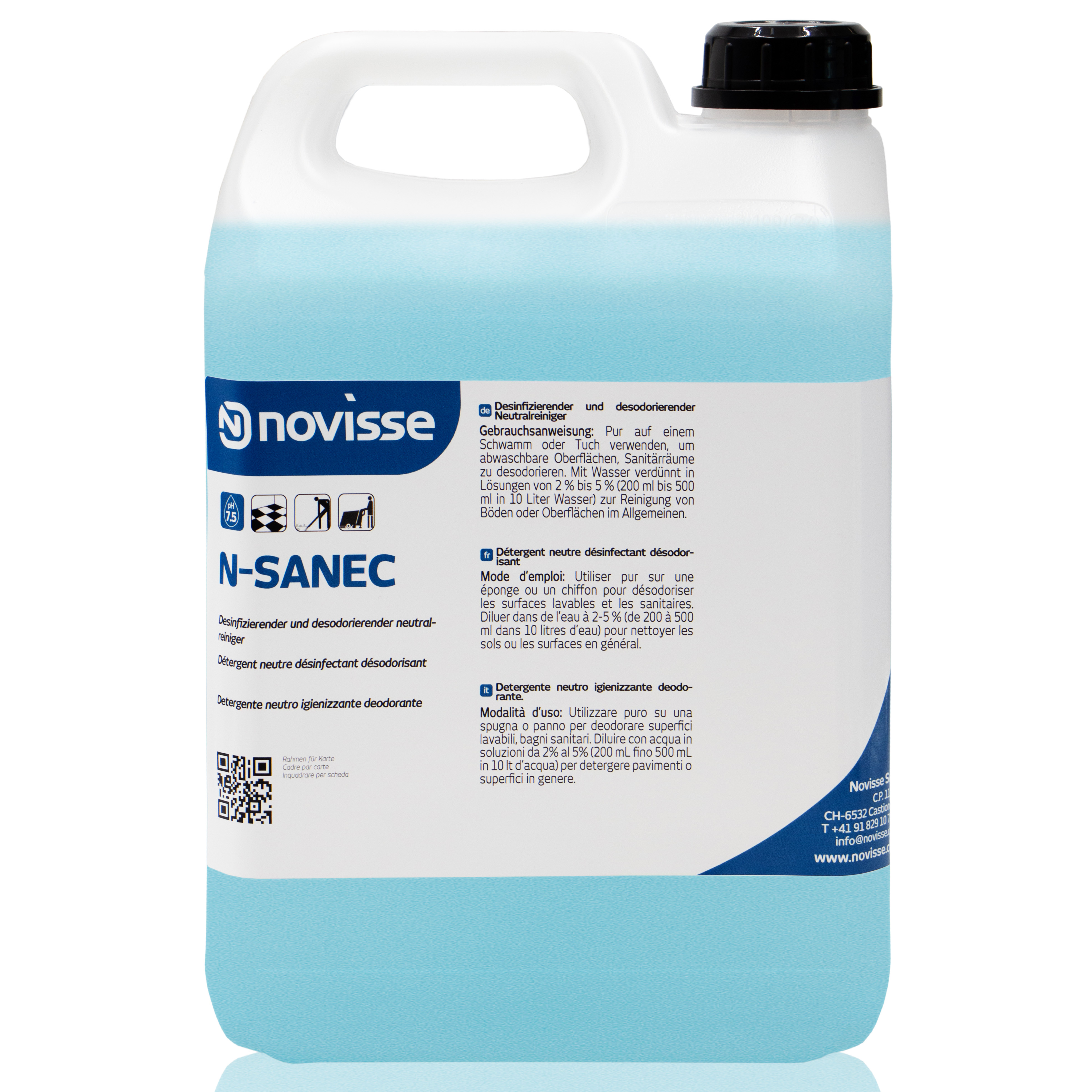 N – SANEC è un detergente liquido alcolico. L’utilizzo del benzalconio cloruro come principio attivo, in miscela bilanciata con tensioattivi non ionici ed essenze balsamiche, garantiscono un ottimo effetto deodorante-detergente, duraturi nel tempo. N – SANEC, è particolarmente indicato per pulire e deodorare luoghi “a rischio di contaminazione”: locali pubblici, scuole, uffici, spogliatoi e servizi igienici. Essendo un detergente va risciacquato.