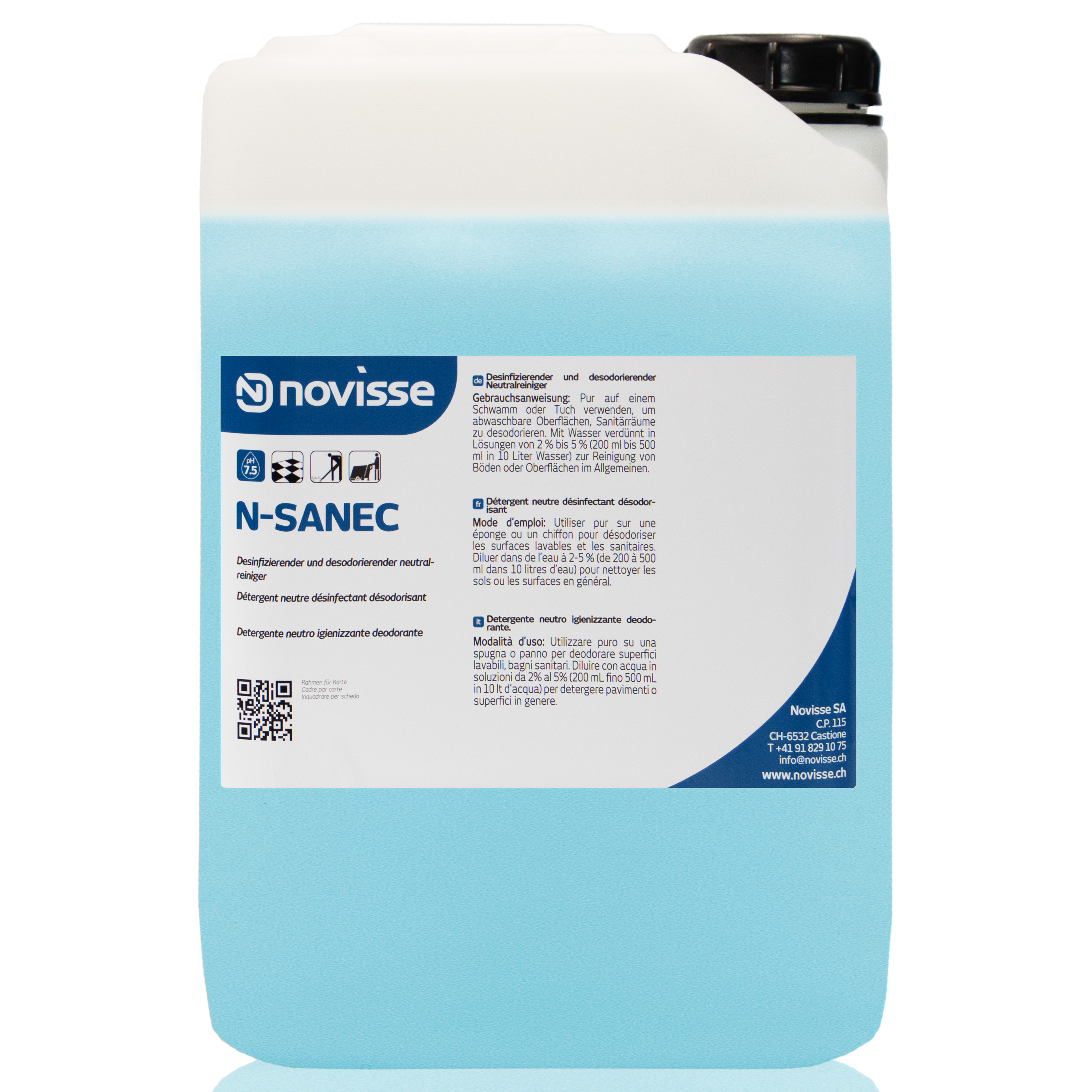 N – SANEC è un detergente liquido alcolico. L’utilizzo del benzalconio cloruro come principio attivo, in miscela bilanciata con tensioattivi non ionici ed essenze balsamiche, garantiscono un ottimo effetto deodorante-detergente, duraturi nel tempo. N – SANEC, è particolarmente indicato per pulire e deodorare luoghi “a rischio di contaminazione”: locali pubblici, scuole, uffici, spogliatoi e servizi igienici. Essendo un detergente va risciacquato.