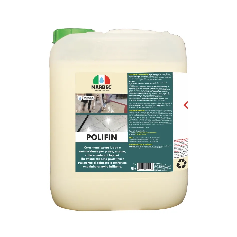 POLIFIN è una cera metallizzata lucida per materiali lapidei collocati all’interno: cotto, pietra naturale assorbente, agglomerati cementizi. Idoneo anche per materiali resilienti (PVC, linoleum, pavimenti in resina).